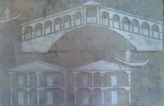 The handpainted 6-panel screen will be a focal point to the guest bedroom, sitting behind the headboard. Painted and glazed in antique metallics, the entire screen will then be hand painted with a city scene using stencils (specially designed and cut for this project) and fine hand work.