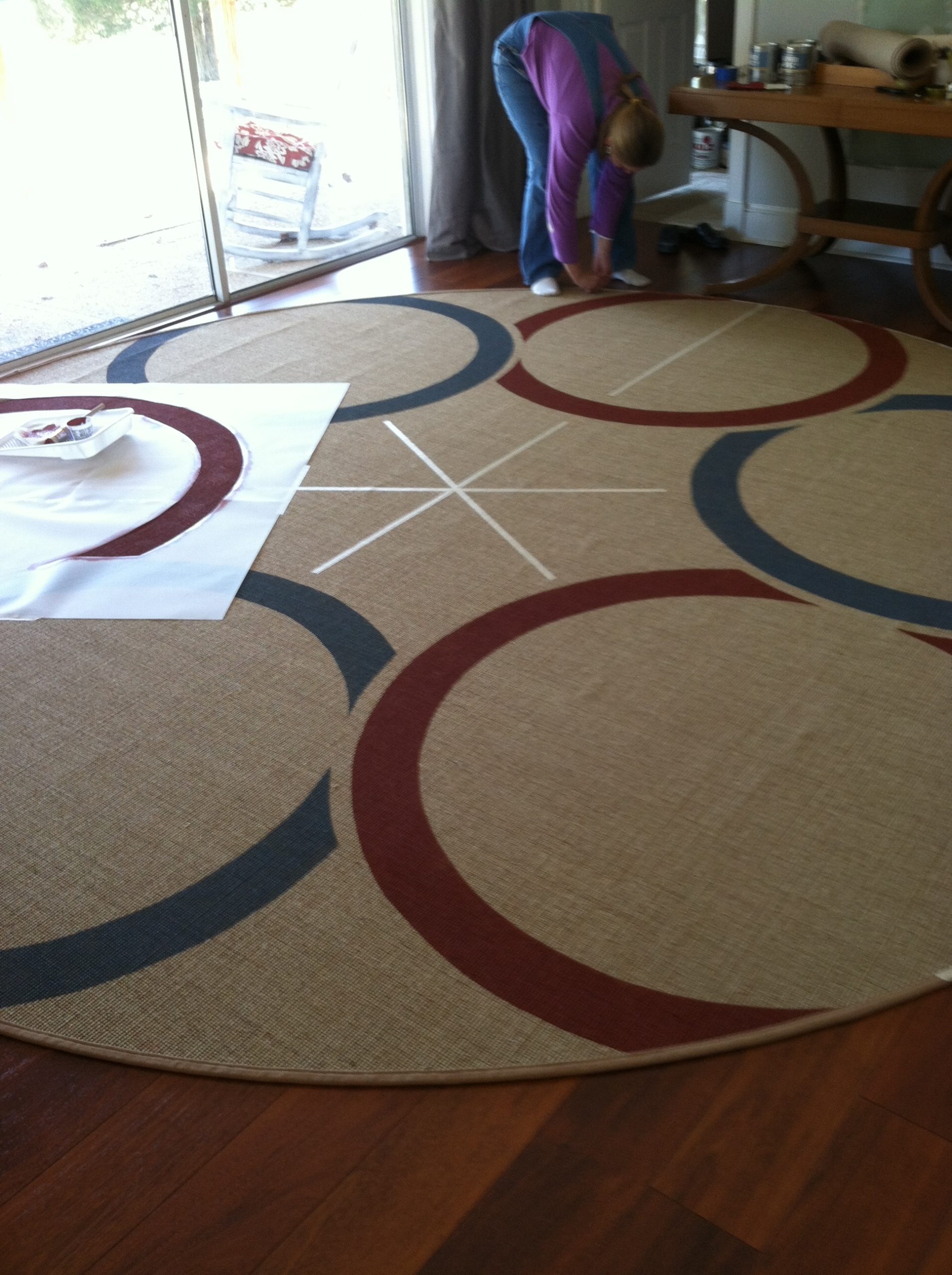 Next we get all the colors decided. Scott used these two great fabrics on the chairs and windows. We then custom mixed the colors for the rug pattern based on these. I always tell people, you can adjust the color of the paint because we’re custom. You can’t adjust the color of the fabric (unless we’re painting it!). Okay, so those stripes of color on the sisal are the samples for Scott to approve. He came to the studio to do a final tweak on the grey color which needed to be darker.
