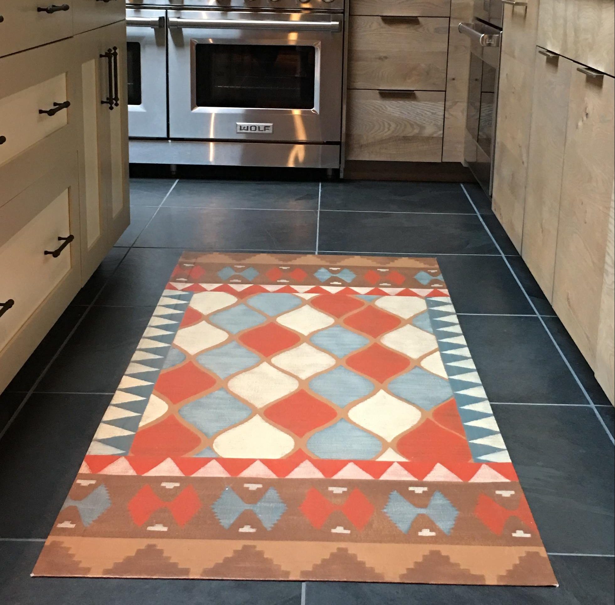 This kilim style floorcloth was inspired by the kitchen tile backsplash. The design tied the various elements together: the chair leather, the slate floor and the ogee tile backsplash are all reflected here in the colorful floorcloth.