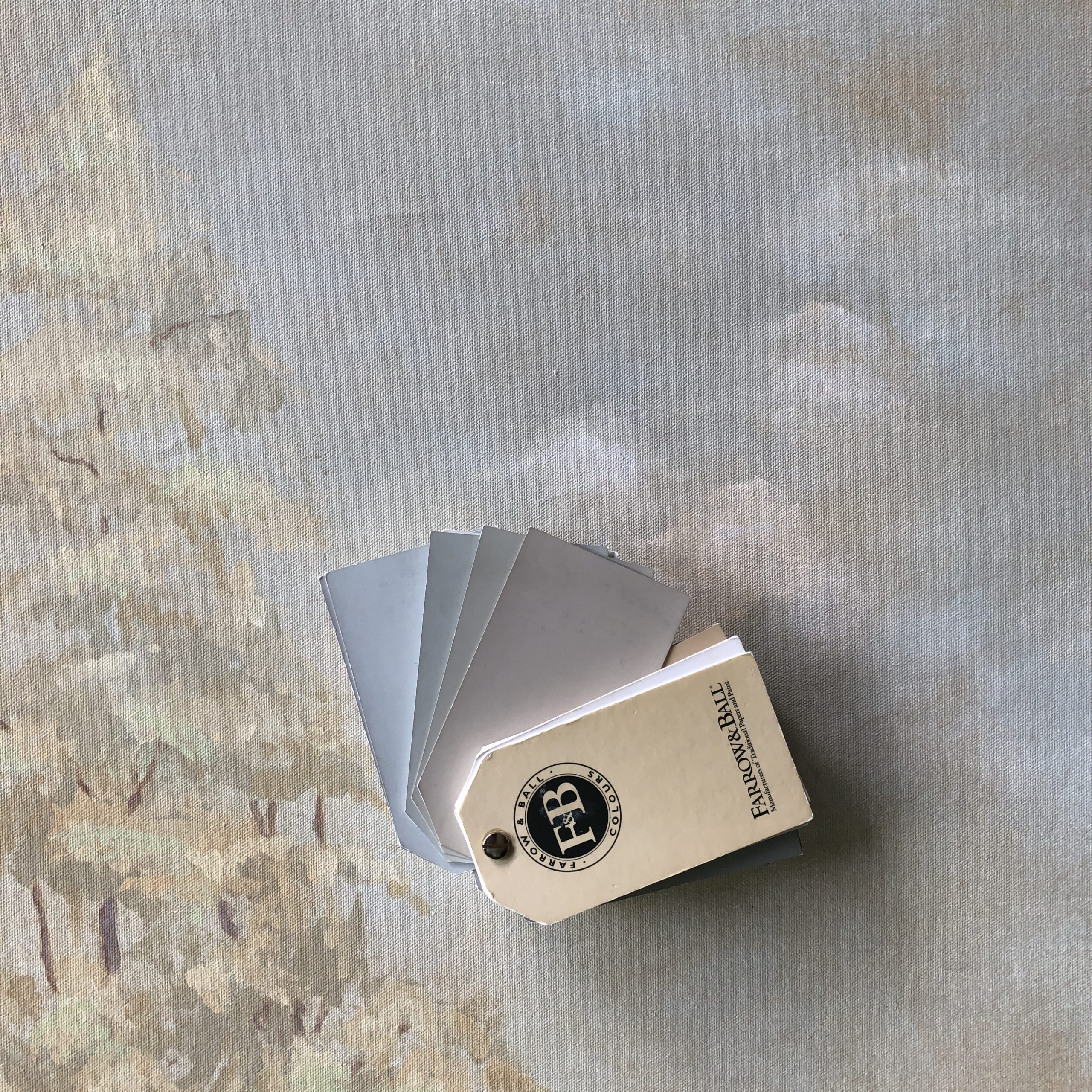 We achieved this soft mood with just the right colors with Farrow and Ball Paints’s French Gray, Green Blue and Borrowed Light. [Farrow and Ball Paints]