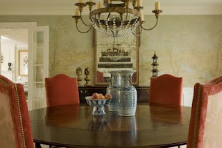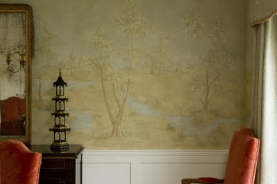 Do you see her red chairs? Maybe I should call them persimmon, they aren’t quite red, are they? We added a sprinkle of that color as berries and accents in the wall mural to marry the two elements.