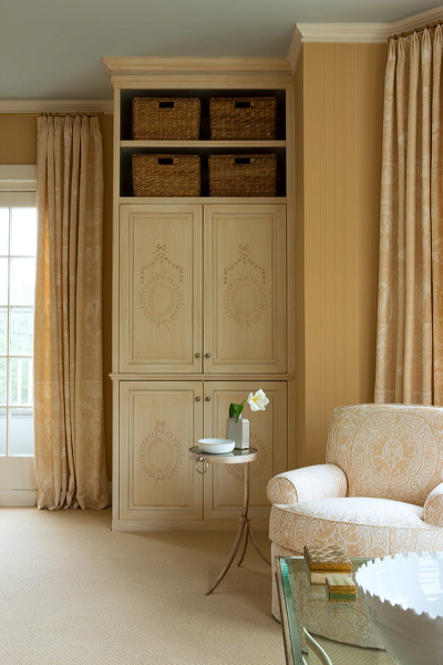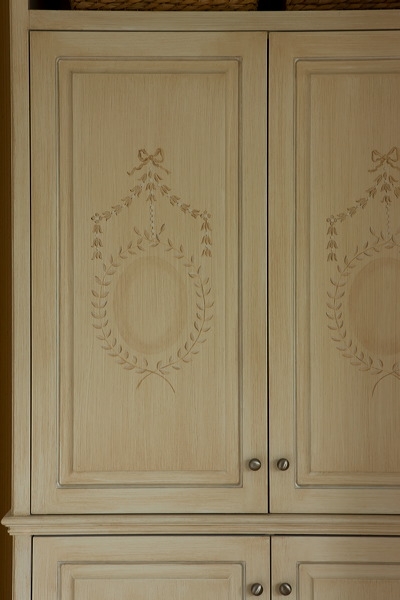 Sally Steponkus had the master bedroom in 2010 and was presented with this built-in to work around. She could have played it safe and painted it white, but instead had us glaze the piece and hand paint the doors with these charming cameos and bell flower swags. Now it’s a focal piece that adds to the classical design aesthetic that Sally is known for.