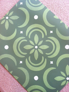 Liz showed us her fabric swatches and a design that she wanted us to use on the floor. We came up with some color selections and created a sample board for approval. She chose the green and cream sample (left), which will be easier to live with for longer. The orange dots are fun, but a few years down the road you might get tired of them.
