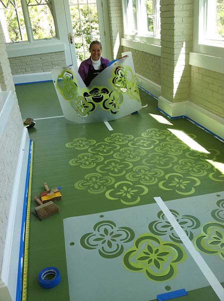 Next we had the stencil laser cut, so we had a few of the exact same stencil. Here’s Amy painting the first color green. We come back around and put the cream dots and diamonds down next. We used Benjamin Moore Porch Paint, #546 and #413 in the classic deck.