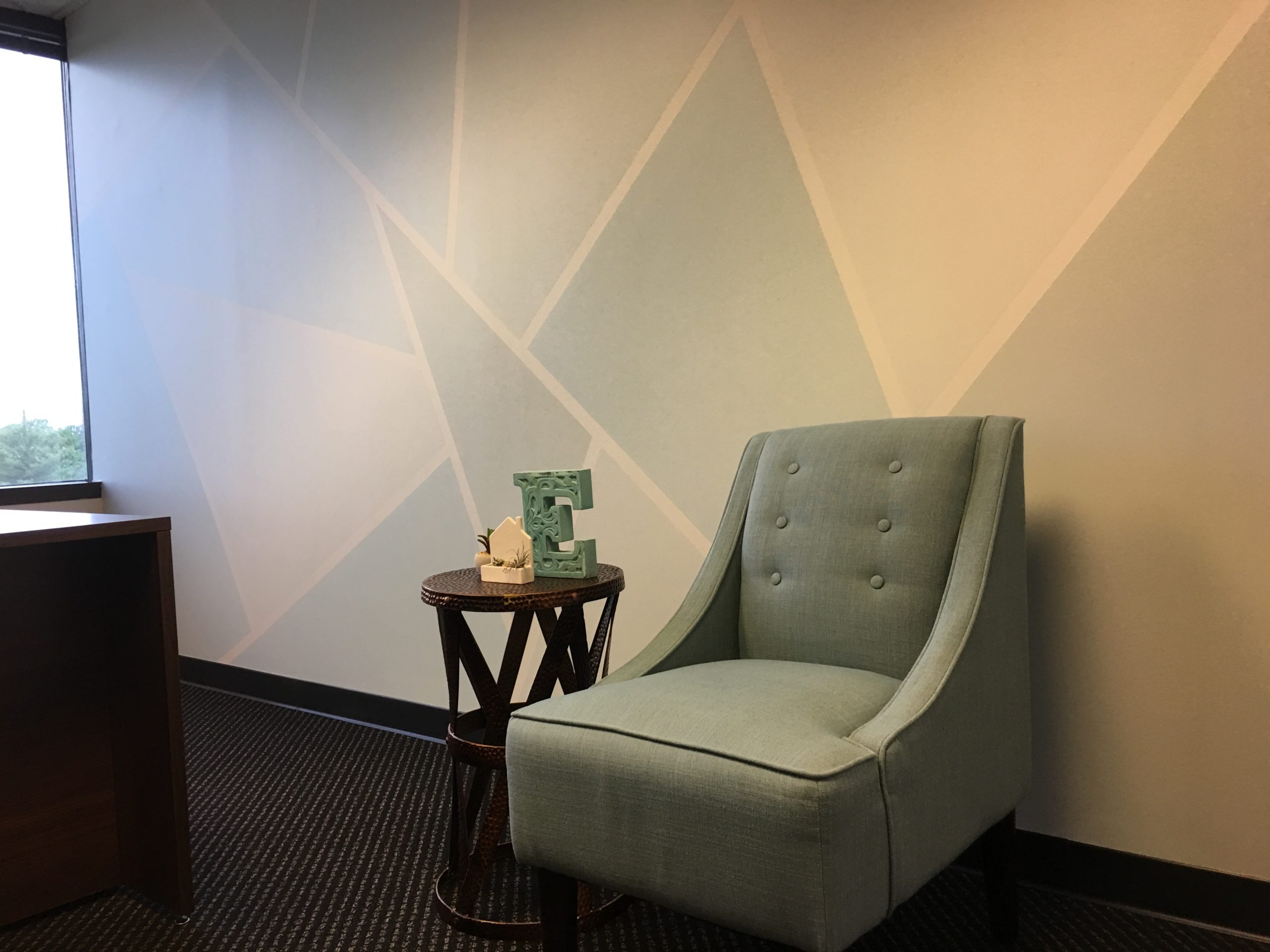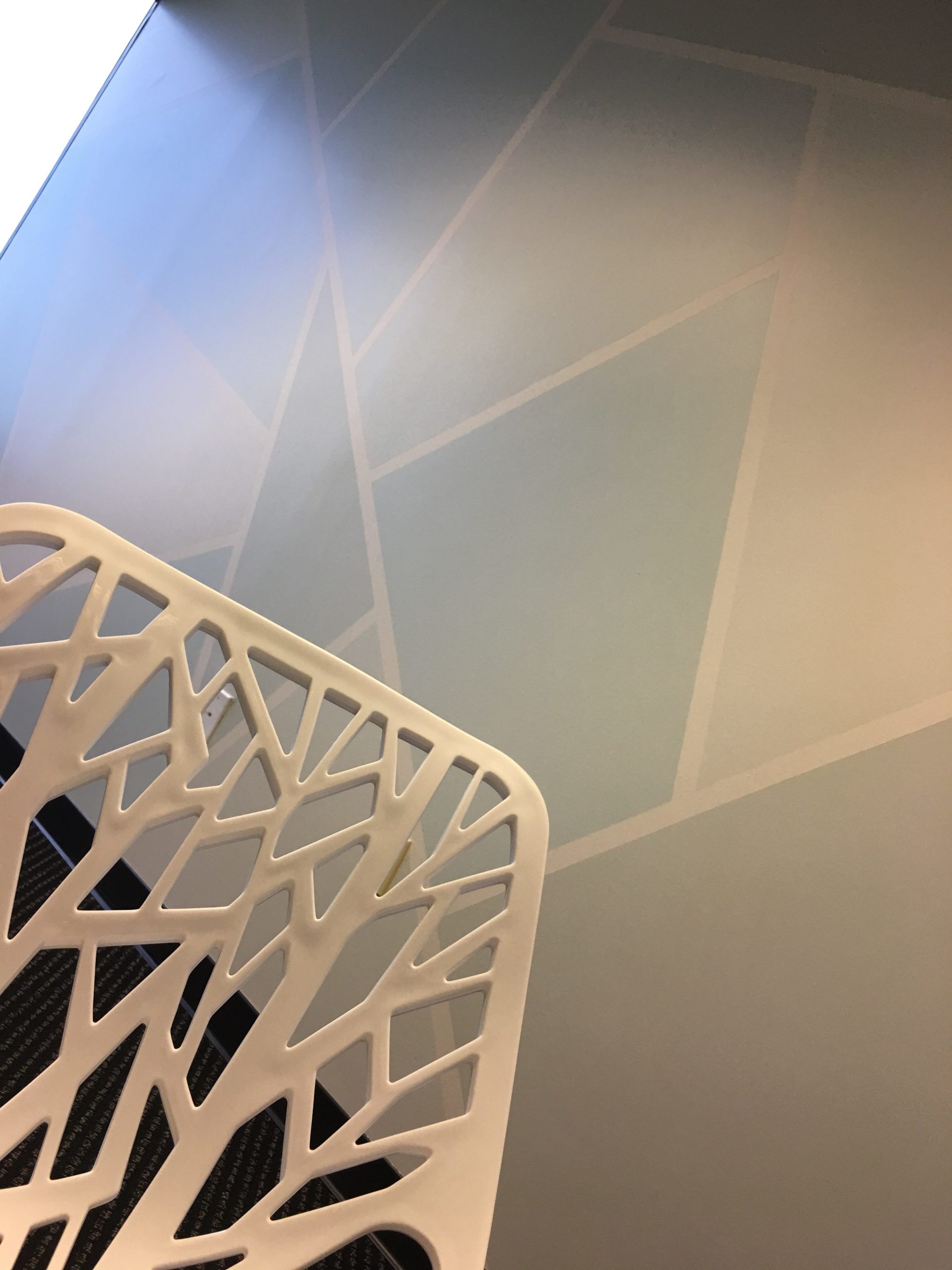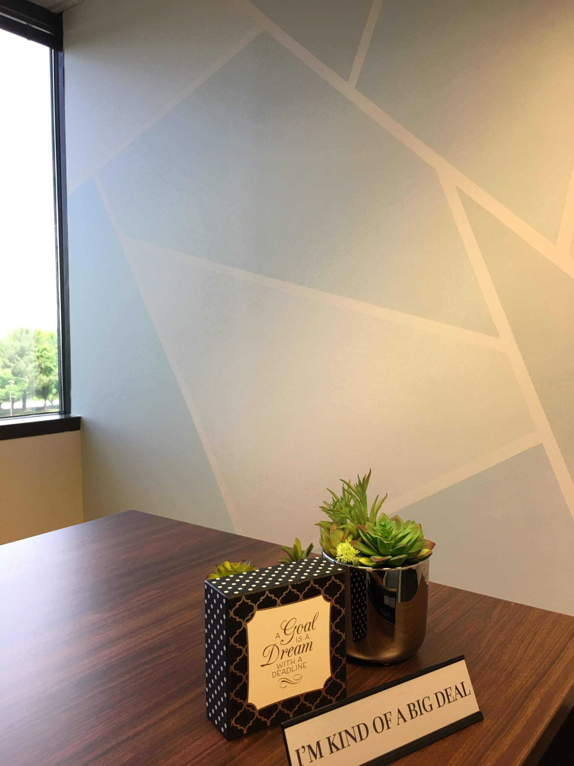 How to take a standard high rise office design and make it your own, though? Start by adding a great wall finish like this geometric stencil pattern. Try hand painting an accent wall in professional tones of gray blue. We started with Benjamin Moore 2062-40 as a jumping off point. The colors were then hand mixed so they coordinate with the slate blue, linen chair. These colors are elegant and sophisticated, so it’s the pattern that makes it a little more dynamic.