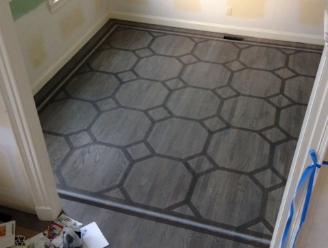This Alexandria home is undergoing significant renovations, so it was super smart to have the floors refinished at the same time. The floors were stained in Perfect Gray then painted with the Octagonal Key pattern. (Check out that layout, thank goodness we love geometry!).