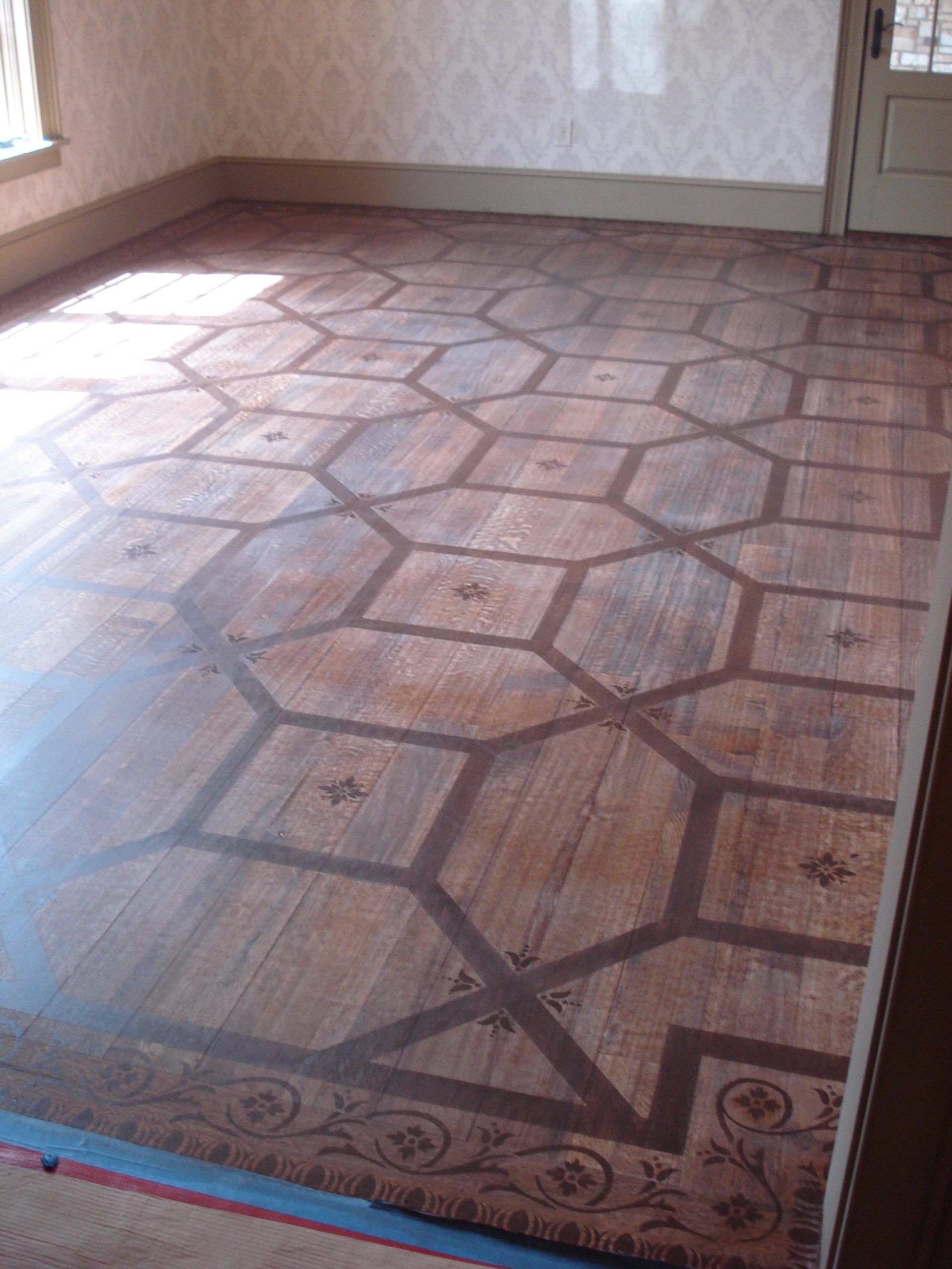 Most of the wood floors we do are in wood tones, but occasionally we’re asked to do something in color. How about orange! Can you see the Octagonal Key over there in apricot? It was still done in a sheer fashion so that the woodgrain showed through, sort of a faux inlay.