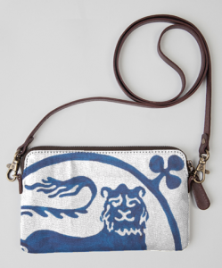 Coming soon: this great clutch purse. Crafted of leather and printed canvas.